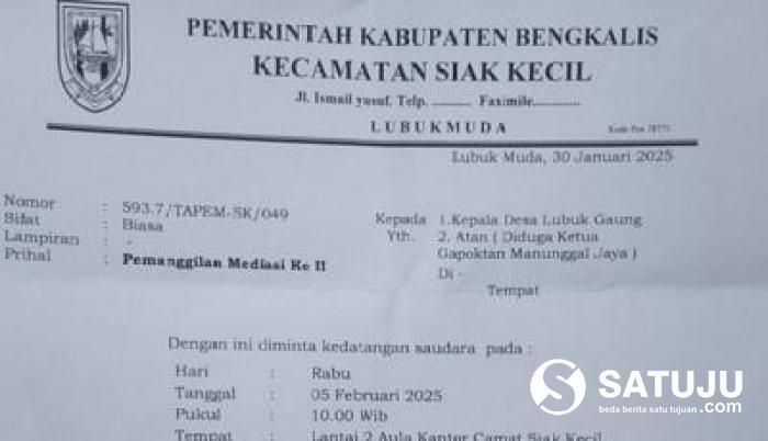 Seperti diungkapkan Sekretaris Gapoktan Manunggal Jaya, Rahap, dalam pernyataannya kepada media pada Selasa (11/2), pihaknya menolak keras dua surat mediasi yang dikeluarkan oleh Camat Siak Kecil. Surat pertama bernomor 593.7/TAPEM-SK/018 tertanggal 13 Januari 2025 dan surat kedua bernomor 593.7/TAPEM-SK/049 tertanggal 31 Januari 2025. Kedua surat tersebut berisi panggilan mediasi terkait dugaan penyerobotan lahan Gapoktan.