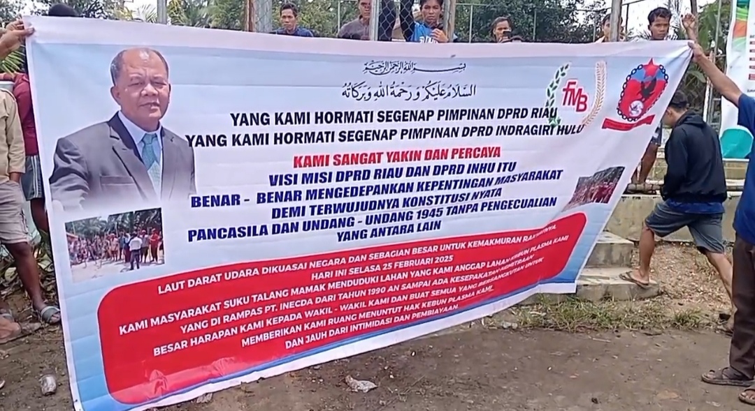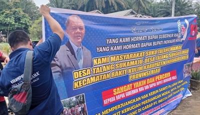 Spanduk bertuliskan kepada Gubernur Riau dan Bupati bantu kami, Kembalikan Hak kami masyarakat. (Poto/istimewa).