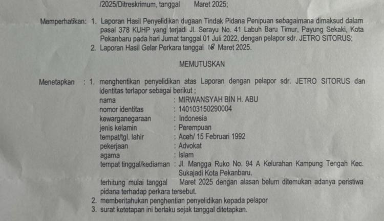 Pekanbaru, Satuju.com – Setelah beberapa lama proses penyelidikan terhadap laporan yang disampaikan oleh Jetro Sitorus terhadap advokat Mirwansyah, SH, di Polda Riau akhirnya dihentikan. Polda Riau akhirnya mengeluarkan Surat Penghentian Penyelidikan (SP3) Nomor: SK.Lidik/09/III/Res.1.11/2025 pada tanggal 20 Maret 2025, yang menyatakan bahwa laporan terkait dugaan tindak pidana penipuan tersebut tidak terbukti.