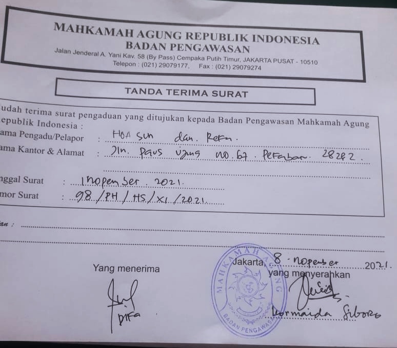 Kepada awak media, Kormadia Siboro Mengatakan bahwa pada tanggal 1 November, kliiennya melalui Firma Hukum HOA SUN dan Rekan telah melayangkan surat kepada Mahkamah Agung untuk meminta salinan putusan kasasi Mahkamah Agung. “Dengan nomor Surat 98/PH/HS/XI/2021” ucap Kormaida Siboro, Selasa (9/11/21) kepada awak media.