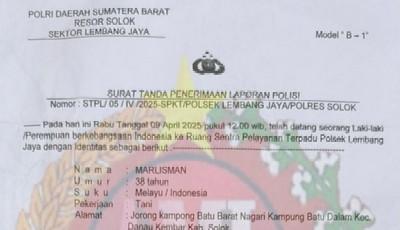 Kasus ini telah dilaporkan ke Polsek Lembang Jaya, Kabupaten Solok, melalui laporan polisi Model B-1 dengan nomor: STPL/05/IV/2025-SPKT/POLSEK LEMBANG JAYA/POLRES SOLOK, tertanggal Rabu, 9 April 2025. Laporan tersebut ditandatangani oleh Aipda Ronaldy Yuasra, petugas SPKT "A".