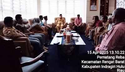 Suasana Audiensi, Bupati Indragiri Hulu (Inhu), Agus Ade Hartarto, Kadisbun Dedi Dianto, Fadri Hendra, Pendiri Forum Penyelamat Aset Negara (FPAN) 4 Kabupaten dan Provinsi, Sekertaris PKN Kabupaten Inhu Ali Amsar Siregar, Ketua Ikatan Wartawan Online IWO Inhu Rudi Walker Purba, Kades Talang Suka Maju Susi Susanti, Selasa (15/4/2025). (Poto/ist).