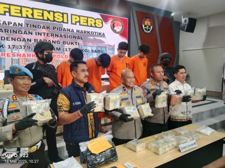 Bengkalis, Satuju.com - Penyelundupan narkotika jenis sabu seberat 17,37 kilogram dari jaringan internasional digagalkan Direktorat Reserse Narkoba Polda Riau. Pengungkapan ini dilakukan pada 12 Mei 2025 dan melibatkan penangkapan empat tersangka.