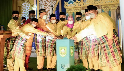 Bupati Kasmarni yang tiba di lokasi acara tepat pukul 20.00 WIB dengan pakaian melayu warna kuning didampingi Wakil Bupati H Bagus Santoso dan Ketua Tim Penggerak PKK Kabupaten Bengkalis Hj Siti Aisyah.