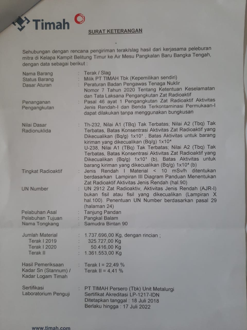 Tertulis dalam surat tersebut mengatakan bahwa tins slag yang pengiriman tins slag dari Pelabuhan Tanjung Pandang Belitung ke Pelabuhan Pangkalbaam berpedoman dengan Peraturan Badan Pengawas Tenaga Nuklir Nomor 7/2020 Tentang Ketentuan Keselamatan dan Tata Laksana Pengangkutan Zat Radioaktif.