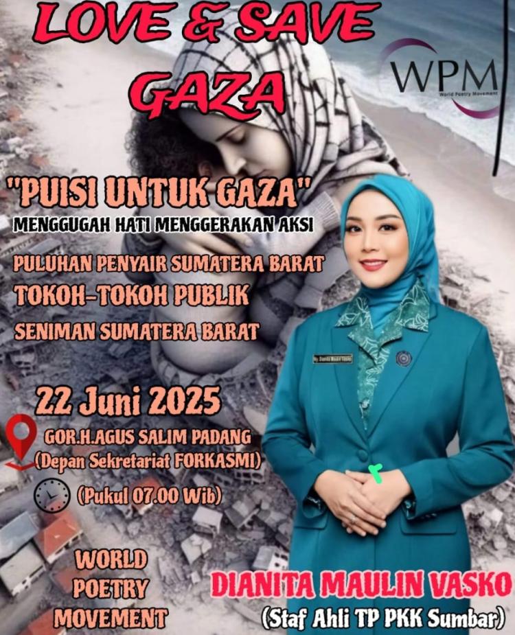 Padang, Satuju.com - Dianita Maulin Vasko, Ketua BKOW yang juga Staf Ahli Tim Penggerak PKK Sumbar, bersama Ibnu Azis, Wakil Wali Kota Bukittinggi, akan membacakan puisi untuk Gaza bersama penyair, seniman, dan tokoh masyarakat Sumbar pada Minggu pagi(22/6/2025) di area Forkasmi GOR Agus Salim, Padang, Provinsi Sumatera Barat.