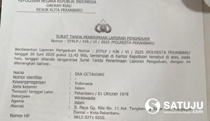 Pekanbaru, Satuju.com — Seorang perempuan warga negara Indonesia, Eka Octaviani (46), resmi melaporkan suami yang berkewarganegaraan Amerika Serikat, Ahmad Feyez Banni (62), ke Polresta Pekanbaru atas dugaan kekerasan dalam rumah tangga (KDRT) dan ancaman terhadap keselamatan keselamatan.