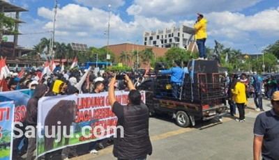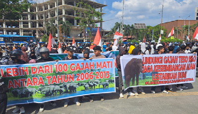 PEKANBARU, Satuju.com - Ribuan aksi massal dari Aliansi Masyarakat Penyelamat Habitat (AMPH) Gajah Sumatra Wilayah Provinsi Riau membanjiri depan Kantor Gubernur Riau, Selasa (24/6/25).