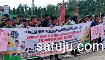 Inhu (Riau), Satuju.com - Puluhan warga dari empat desa di Kabupaten Indragiri Hulu (Inhu), yakni Desa Sibabat, Desa Talang Limau, Desa Suka Maju, dan Desa Kerumutan (Kabupaten Pelalawan), menggelar aksi damai di depan Kantor Bupati Inhu, Selasa (24/6/2025). Aksi ini menjadi bentuk nyata perjuangan masyarakat yang menuntut hak atas lahan kemitraan yang telah lama dijanjikan oleh perusahaan perkebunan, PT. Inecda, namun tak kunjung direalisasikan.