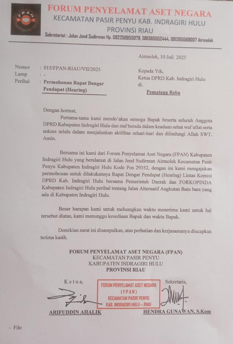 Indragiri Hulu, Satuju.com – Forum Penyelamat Aset Negara (FPAN) Kecamatan Pasir Penyu, Kabupaten Indragiri Hulu, mengajukan permohonan kepada DPRD setempat untuk mengadakan Rapat Dengar Pendapat (RDP) lintas komisi. Rapat ini ditujukan untuk membahas permasalahan jalan alternatif yang digunakan oleh angkutan batu bara yang saat ini menjadi sorotan warga.