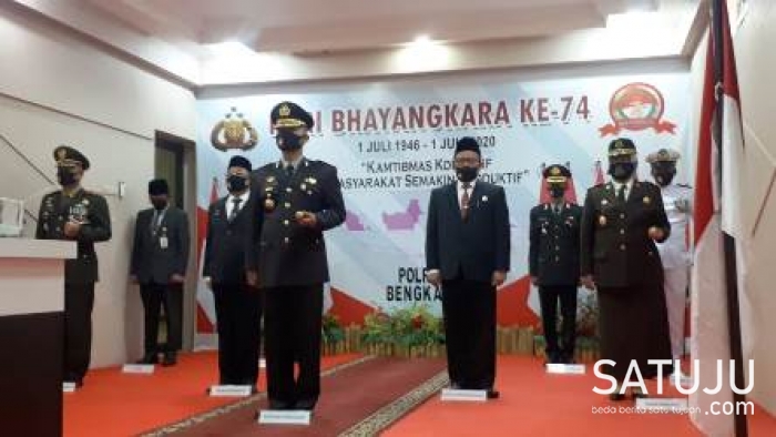 Upacara Kebangsaan Hari Bhayangkara ke 74 tahun 2020 secara virtual dengan tema "Kamtibmas Kondusif masyarakat semakin produktif", berlangsung di ruang catur prasetya Lantai II Polres Bengkalis, Riau, Rabu (1/7/20).