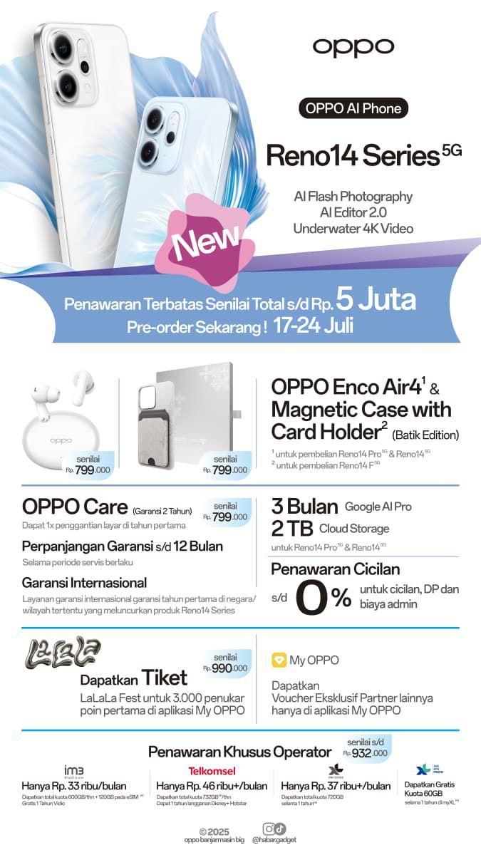 OPPO Reno14 Series 5G hadir dengan fitur-fitur canggih seperti AI Flash Photography, AI Editor 2.0, dan Underwater 4K Video, ideal bagi pecinta fotografi maupun pembuat konten. Selama periode pre-order (17–24 Juli 2025), pembeli akan mendapatkan berbagai bonus spesial: