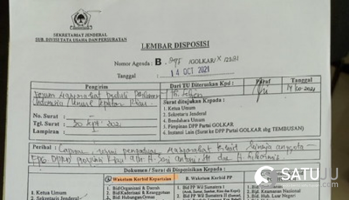 JAKARTA, Satuju.com - Hal itu disampaikan Nur, bagian Tata Usaha dan diperkuat dengan penjelasan bu' Dede, Staf Koordinator Bidang (Korbid) Kepartaian DPP Partai Golkar di Jakarta.