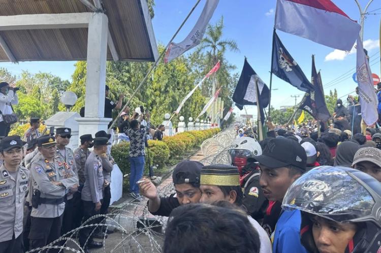 Hingga saat ini, massa terus melakukan orasi dan berusaha menjebol pagar kawat besi yang telah dipasang polisi sejak pagi tadi.