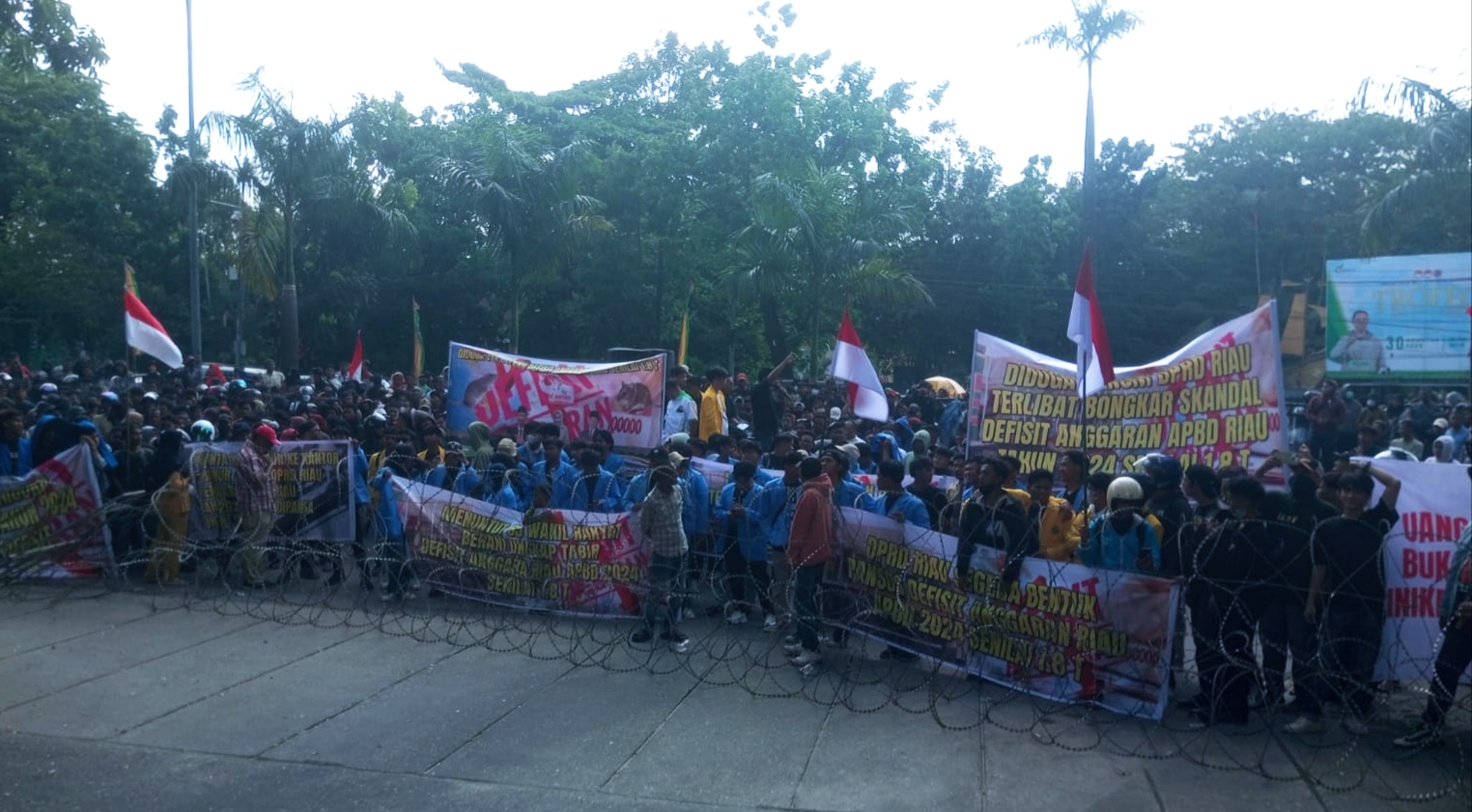 Mahasiswa tak dapat beasiswa, jalan rusak berlubang tak terpikirkan oleh mereka. Anggota DPRD Riau berfoya-foya. Di tengah orasi itu, massa berusaha menggoyang-goyangkan barikade kawat berduri yang dipasang polisi di pintu masuk DPRD Riau di Jalan Sudirman Pekanbaru, Rabu sore 27 Agustus 2025 sekitar pukul 15.00 WIB.