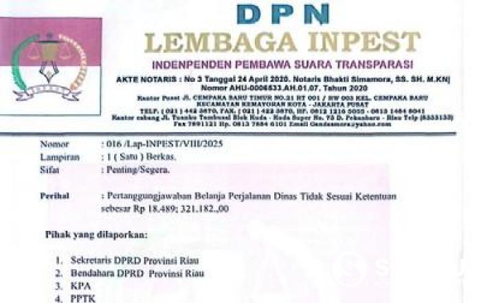 Laporan tersebut menyebabkan tidak adanya penyimpangan dalam pertanggungjawaban Surat Perintah Perjalanan Dinas ( SPPD ) di lingkungan DPRD Provinsi Riau. Berdasarkan hasil penelusuran INPEST, terdapat belanja perjalanan dinas yang tidak sesuai ketentuan dengan nilai mencapai Rp18.489.321.182,00.