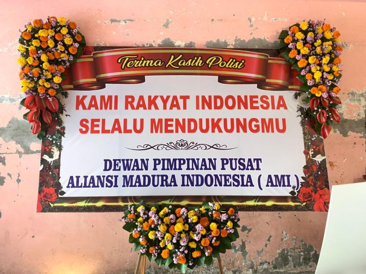 Salah satu elemen yang turut menyampaikan dukungan adalah Aliansi Madura Indonesia (AMI). Organisasi masyarakat tersebut mengirimkan karangan bunga berisi pesan moral dan semangat untuk para anggota Polri yang bertugas di Surabaya.