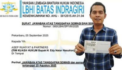 Kampar, Riau, Satuju.com - Konflik lahan seluas ±4 hektar di Jalan Uka, Dusun II, Desa Rimba Panjang, Kecamatan Tambang, Kabupaten Kampar, kian memanas setelah Lembaga Bantuan Hukum Indonesia (LBHI) Batas Indragiri melayangkan Surat Jawaban Atas Tanggapan Somasi dan Somasi I bernomor 009/LBHI/SP/VIII/2025 tertanggal 5 September 2025. Surat ini ditujukan kepada kuasa hukum mantan Wakil Gubernur Riau, H. Edy Natar Nasution, yang namanya turut terseret dalam sengketa lahan tersebut.