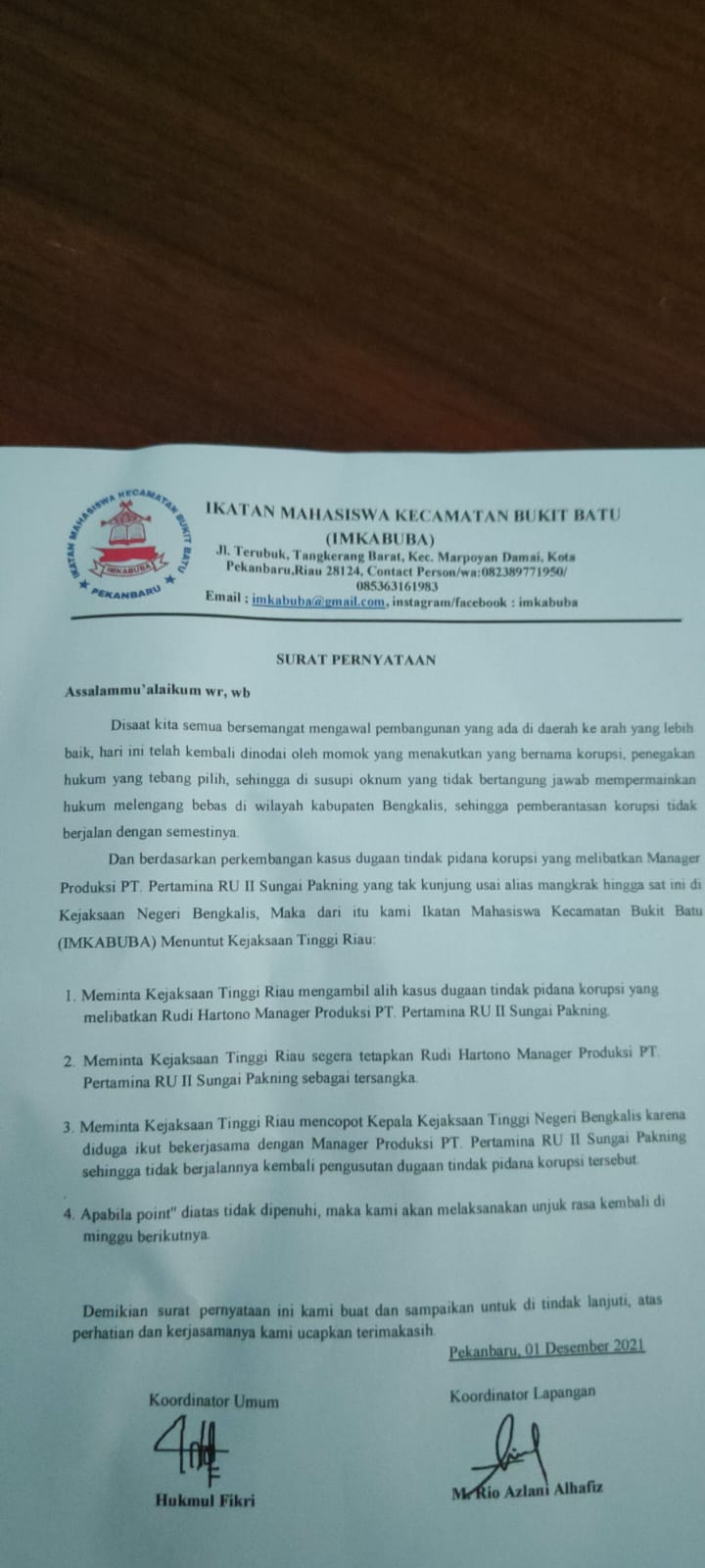 Dugaan Terlibat Manager Produksi Pertamina RU II Sungai Pakning, IMKABUBA Desak Kejati Riau