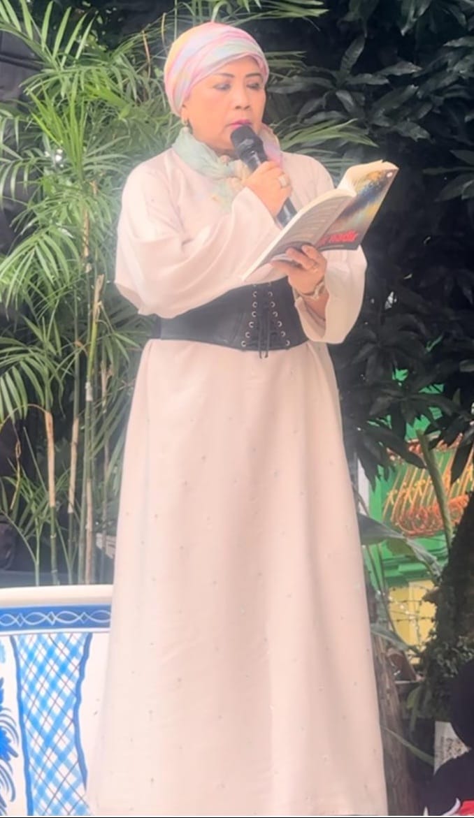 Ket. Poto : Penyair Halimah Munawir baru-baru ini sedang baca puisi guna menarik minat siswa dan siswi di SMAN 31 Jakarta dalam mengembangkan.minat terhadap karya sastra terutama untuk kalangan.Gen Z. (Kir/Lasman).