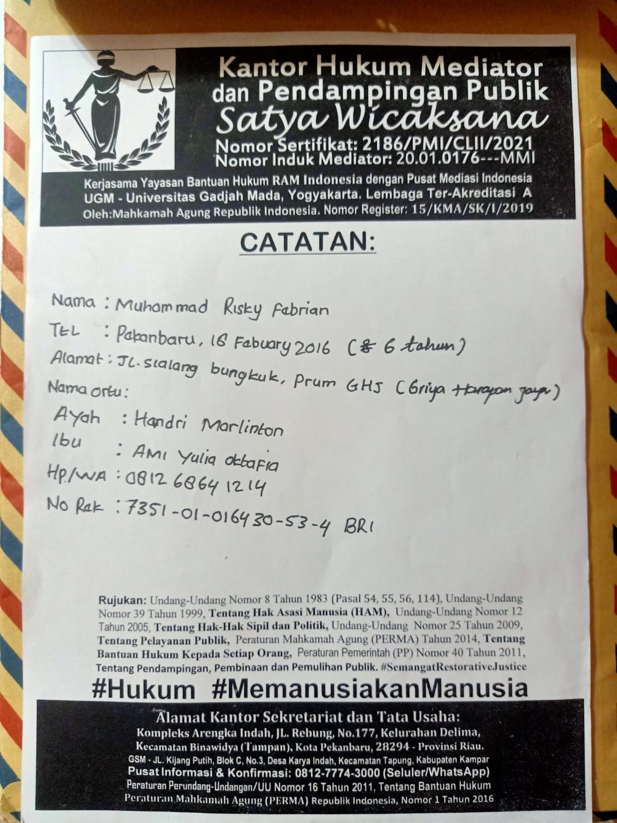 PEKANBARU, Satuju.com - Setelah sebelumnya berhasil membantu bayi laki-laki usia 10 bulan, pengidap penyakit langka, Atresia Bilier atas nama Muhammad Ammar Fathan bin Kaspen Nahar, hari ini Sabtu (4/12/2021) Aktivis Larshen Yunus dan rekan-rekan Kantor Hukum Mediator Pendampingan Publik Satya Wicaksana, tenggorokan, tenggorokan dan atau Leher Bocor).