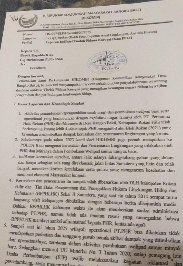 Pekanbaru, Satuju.com — PT Pertamina Hulu Rokan (PHR) dilaporkan ke Polda Riau atas dugaan tindak pidana korupsi (Tipikor) terkait penyimpangan Dana Pengelolaan dan Perlindungan Lingkungan Hidup (PPLH). Laporan resmi diajukan oleh Himpunan Komunikasi Masyarakat Desa Bangko Bakti (HIKOMBI), yang menuding PHR dan mitranya gagal menjalankan kewajiban reklamasi serta pemulihan lingkungan pasca-aktivitas tambang di wilayah operasional Blok Rokan.