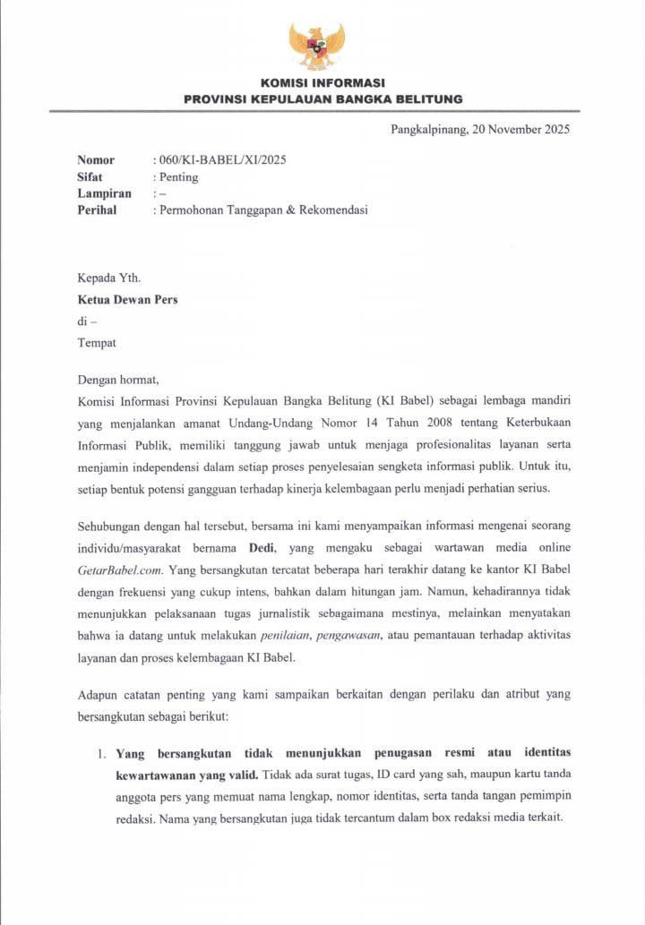 Pangkalpinang, Satuju.com – Komisi Informasi Provinsi Kepulauan Bangka Belitung (KI Babel) akhirnya mengambil langkah resmi dengan melayangkan surat kepada Dewan Pers terkait keberadaan seorang individu bernama Dedi, yang mengaku sebagai wartawan media online GetarBabel.com. Jum'at (21/11/2025).