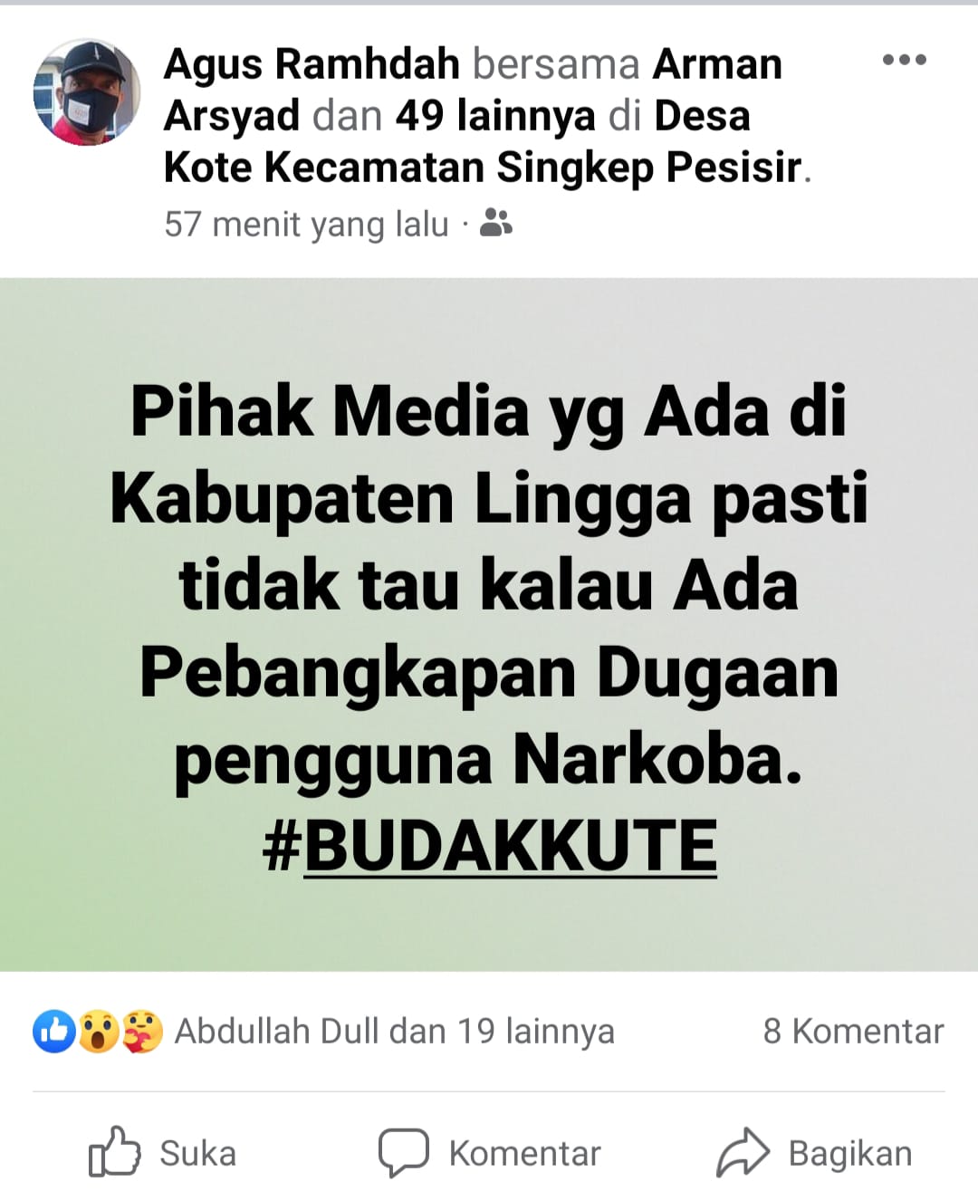"Pihak Media Yang Ada di Kabupaten Lingga Pasti Tidak Tahu Kalau Ada Pebangkapan Dugaan Pengguna Narkoba,BUDAK KOTE," katanya.