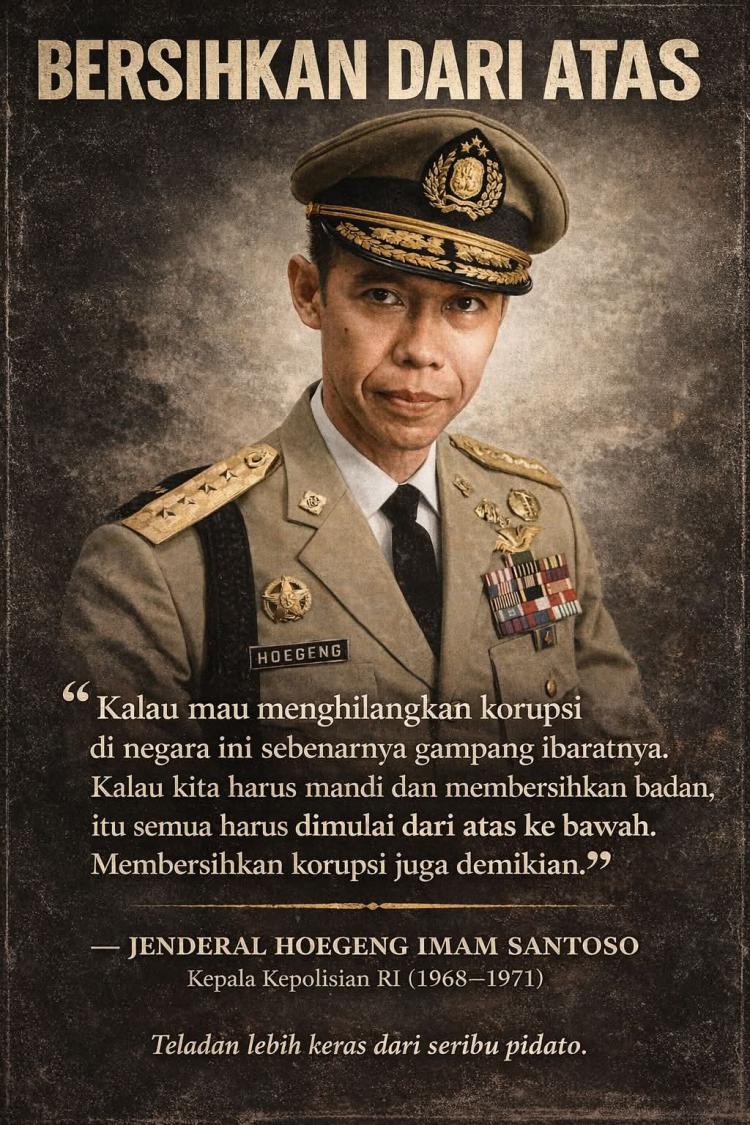 Hoegeng memahami bahwa membersihkan diri dari "atas" itu menyakitkan. Itu menuntut pemimpin untuk mematikan ego, menolak kenyamanan (gratifikasi), dan siap dikucilkan karena "terlalu bersih" di tengah lingkungan yang kumuh. Membersihkan diri dari atas berarti siap "telanjang" tanpa perlindungan privilege, membiarkan diri diperiksa dan dikuliti oleh standar moral yang paling ketat.