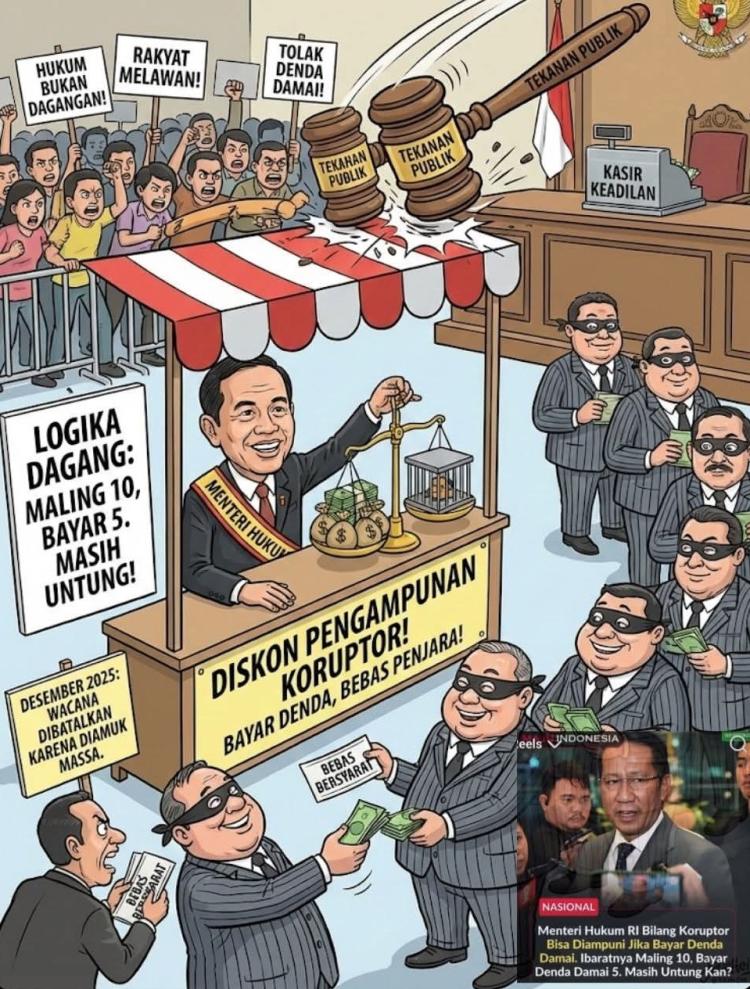 Analogi "Maling 10, Bayar 5" yang viral di media sosial menjadi simbol perlawanan. Wacana ini dianggap mengubah hukum pidana menjadi hukum dagang, di mana keadilan bisa dibeli dan dosa bisa ditebus dengan transfer bank.