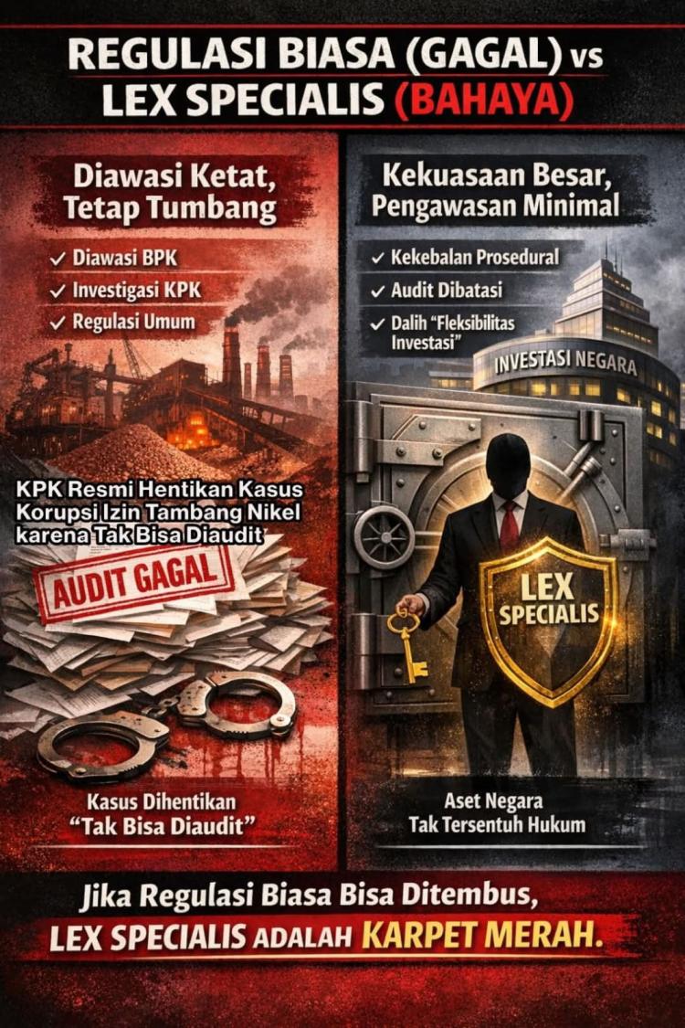 Lex Specialis seringkali menjadi pedang bermata dua. Di satu sisi untuk percepatan, di sisi lain menjadi benteng impunitas. Ketika KPK berkata "tidak bisa diaudit" pada kasus nikel, mereka secara tidak langsung mengakui bahwa tangan hukum negara memiliki batas. Danantara berpotensi diletakkan di luar batas jangkauan tangan tersebut.
