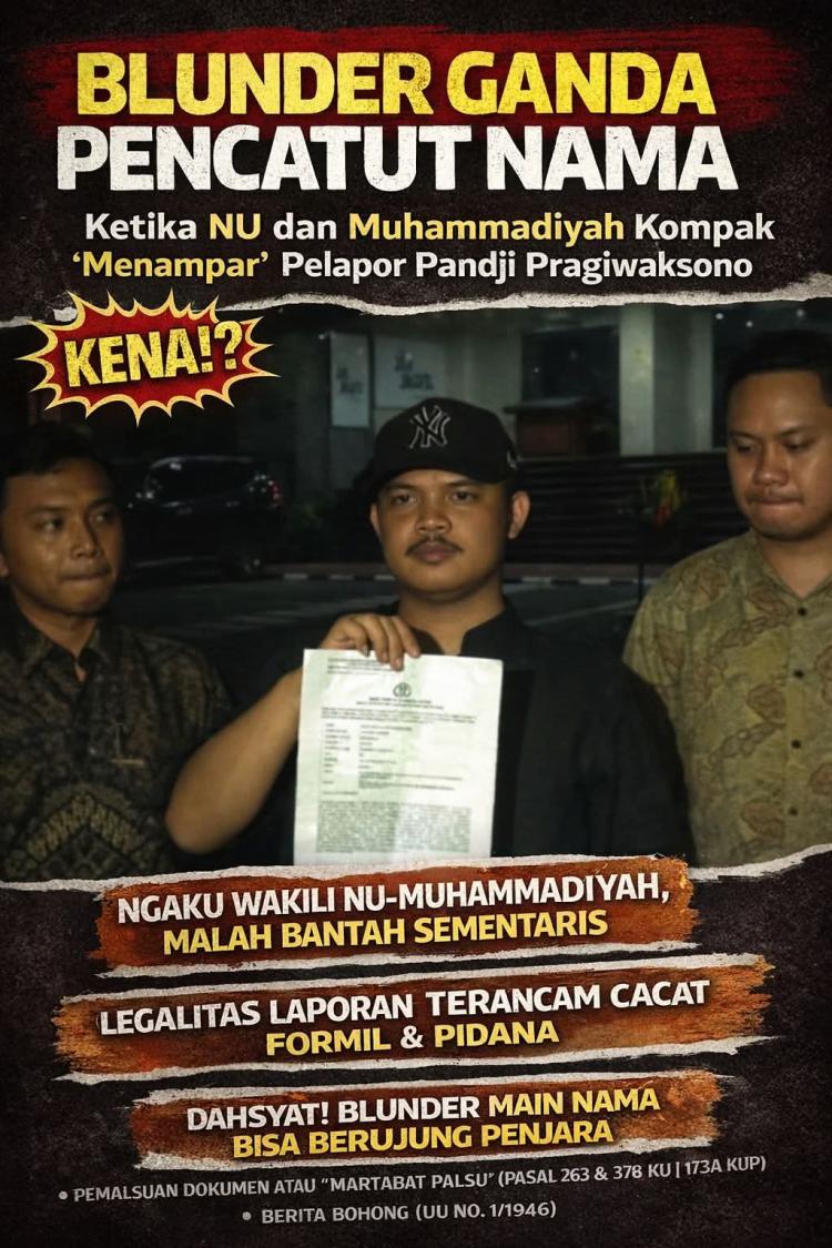 Jika dalam berkas laporannya ke Polda Metro Jaya pelapor melampirkan dokumen, kop surat, atau stempel yang memuat logo NU atau Muhammadiyah tanpa izin otoritas resmi, ancaman 6 tahun penjara menanti. Ini bukan sekadar pelanggaran etika, tapi kejahatan pemalsuan.