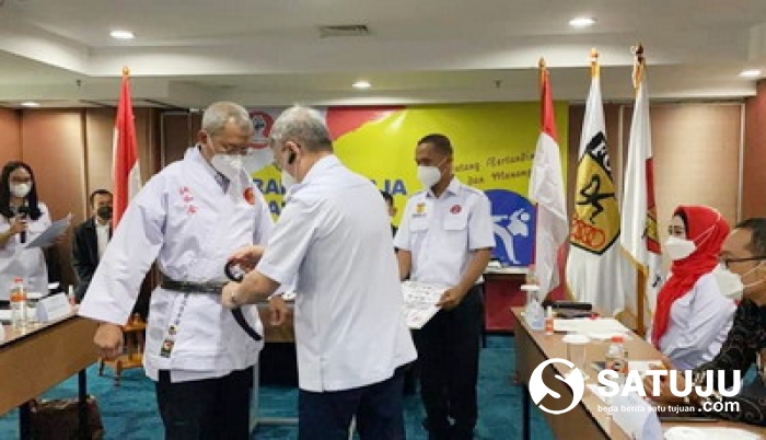 Ket. Pito : Saat pemasangan Sabuk DAN V KEHORMATAN kepada Harjo Susmoro, Ketua Umum PP Goju-Ass Indonesia Periode 2020 - 2025. (Dok. Goju-Ass Indonesia)