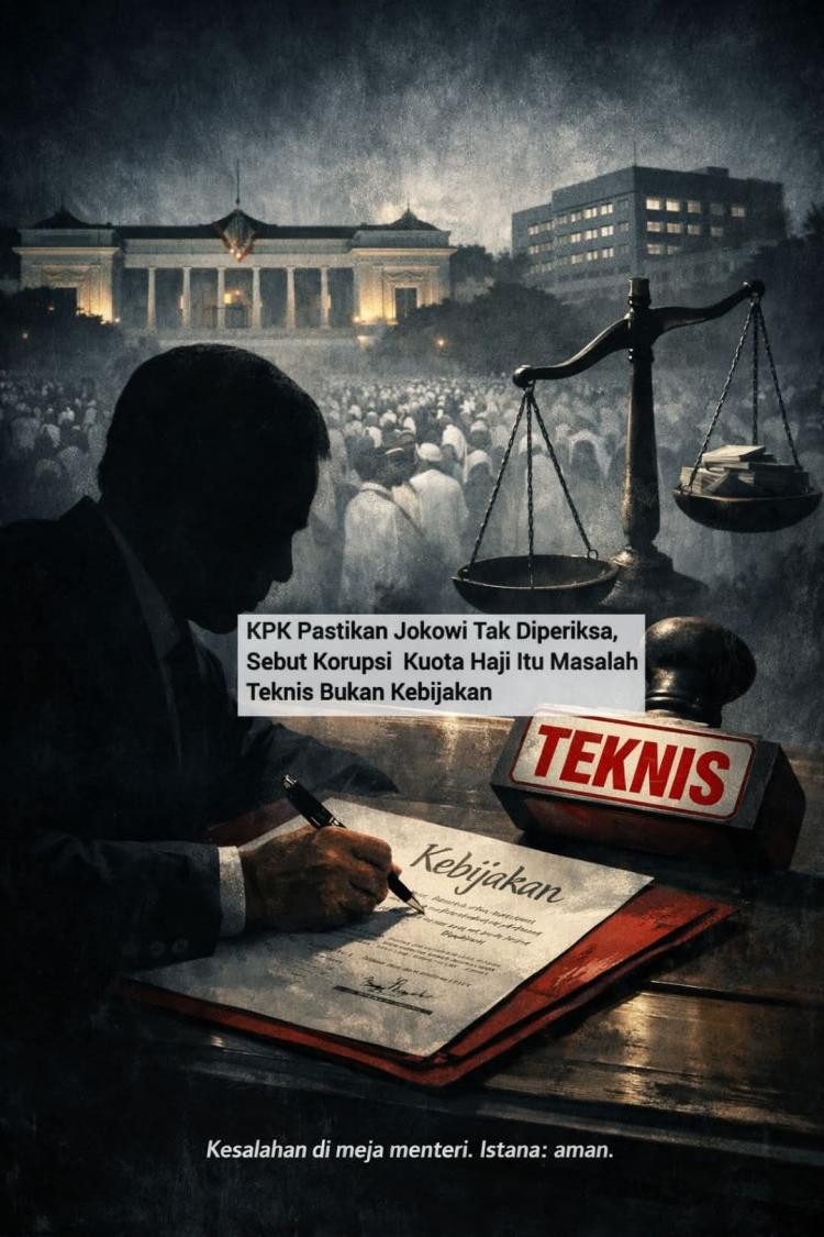 Satuju.com - Garis demarkasi itu ditarik dengan tegas oleh Komisi Pemberantasan Korupsi (KPK): apa yang terjadi di meja Menteri Agama adalah "masalah teknis", sementara apa yang terjadi di meja Presiden adalah "kebijakan". Dengan logika ini, mantan Presiden Joko Widodo dipastikan aman dan tidak akan disentuh dalam sengkarut kasus korupsi kuota haji yang kini menjerat mantan Menteri Agama, Yaqut Cholil Qoumas.