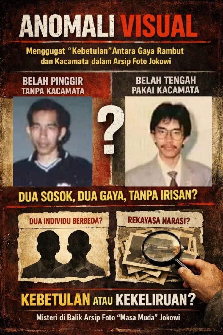 Satuju.com – Di tengah riuhnya diskursus publik mengenai rekam jejak tokoh bangsa, sebuah detail visual yang luput dari perhatian awam kini mencuat ke permukaan. Bukan soal kebijakan atau manuver politik, melainkan sebuah pola inkonsistensi dalam arsip foto yang diklaim sebagai masa muda Joko Widodo. Sebuah pertanyaan sederhana namun menohok kini menyeruak: Adakah seseorang yang mengubah gaya rambut sekaligus status pemakaian kacamata secara drastis dan bergantian dalam satu kurun waktu?