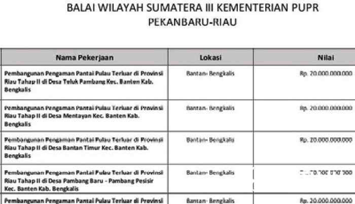 Ket. Poto : daftar paket pekerjaan pembangunan pengaman pantai pulau terluar Provinsi Riau tahap II yang dianggarkan pada tahun 2022 mendatang, Balai Wilayah Sumatera III PUPR Pekanbaru-Riau