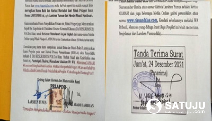 "Surat yang sudah ada tanda terima dari Dit Reskrimsus Polda Riau ini juga akan kami layangkan ke pihak Dewan Pers. Agar terhadap 12 media ini segera diberikan Sanksi Administratif, bila perlu sisi pidananya juga ditegaskan" tutur Larshen Yunus dan Hendri Abadi Hasibuan, Pimpinan Umum Media Online www.riauandalas.com