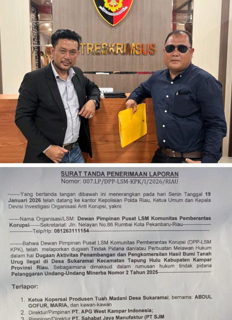 Ketua umum, Dewan Pimpinan Pusat Lembaga Swadaya Masyarakat Komunitas Pemberantas Korupsi (DPP LSM KPK), Toro Laia bersama Kepala Bidang Investigasi, Manganar M Nainggolan, secara resmi melaporkan perbuatan melawan hukum tersebut ke Direktorat Reskrim Khusus Polda Riau, Senin (19/01/2026) lalu.