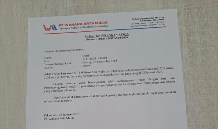 Adapun isi surat yang diterima Durti sebagai berikut. Surat Keterangan Kerja Nomor : 001/HRD/WAM/I/2026. Nama Durti, jabatan Driver Adalah benar karyawan di PT Wahana Arta Mulia telah bekerja di perusahaan Kami semenjak 27 Agustus 2021 sebagai Driver, yang bersangkutan mengundurkan diri pada tanggal 02 Januari 2026, Selama bekerja, bersangkutan telah melaksanakan tugas dengan baik, bertanggung jawab, untuk itu perusahaan mengucapkan terima kasih atas kontribusi, tenaga dan pikiran yang diberikan selama ini.. Demikian surat keterangan ini diberikan kepada yang bersangkutan untuk dapat dipergunakan sebagaimana mestinya. Pekanbaru, 02 Januari 2026, PT. Wahana Arta Mulia.