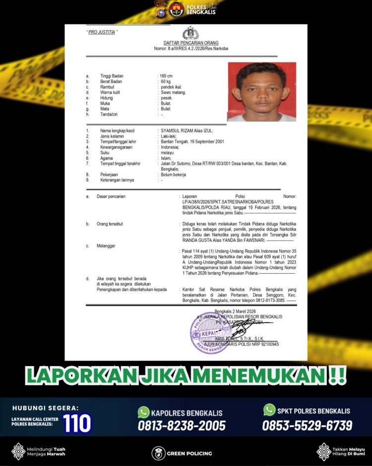 Polres Bengkalis menginformasikan kepada seluruh masyarakat terkait Daftar Pencarian Orang (DPO) dalam perkara tindak pidana narkotika.