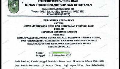 Bengkalis, Satuju.com - Dinas Lingkungan Hidup dan Kehutanan (DLHK) Provinsi Riau menjalin perjanjian kerja sama dengan Koperasi Generasi Mandiri pada tanggal 19 November 2020.
