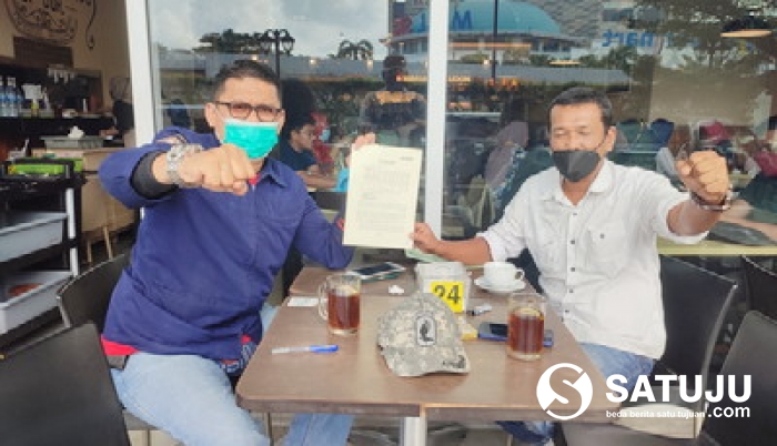 Ket. Poto : Aktivis Larshen Yunus tanda tangan surat Tim kuasa hukum: Dr. Yudi Krismen, S.H., M.H, bersama Pimred Riauandalas.com