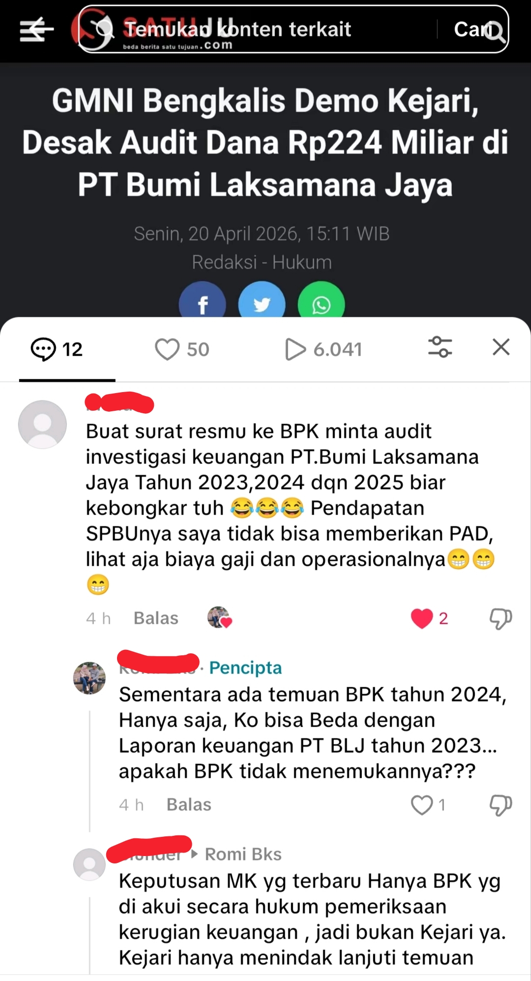Bengaklis, Satuju.com - Aksi unjuk rasa yang digelar Gerakan Mahasiswa Nasional Indonesia (GMNI) Kabupaten Bengkalis di Kantor Kejaksaan Negeri Bengkalis, Senin (20/4/2026), terkait desakan audit dana Rp224 miliar di PT Bumi Laksamana Jaya (BLJ), memicu beragam tanggapan di media sosial. BERITA TERKAIT: https://www.satuju.com/berita/14831/investasi-janggal-hingga-aset-zombie-terkuak-kinerja-dan-tata-kelola-pt-blj-bengkalis-hingga-temuan-bpk-disorot.html