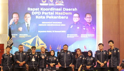 Seluruh Pengurus Partai tampak hadir dalam acara Rakorda kali ini termasuk Komunitas NasDem Millenial Kota Pekanbaru