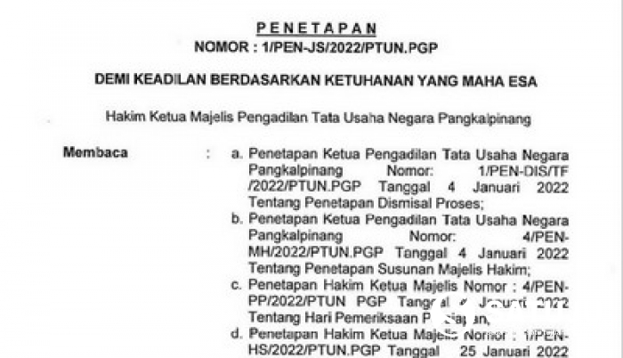 Gugatan perkara sengketa TUN dengan objek hukum lainnya ternyata sudah didaftarkan oleh PT Pulomas Sentosa melalui Dr Adystia Sunggara SH MH MKn selaku kuasa hukum perusahaan, bahkan penetapan jadwal pembacaan gugatan akan dilaksanakan pada hari Rabu tanggal 2 Februari 2022 berdasarkan surat Penetapan Nomor : 1/PEN-JS/2022/PTUN.PGP tertanggal 25 Januari 2022 yang ditandatangani oleh Hakim Ketua Majelis PTUN Pangkalpinang Tiar Mahardi SH MH.