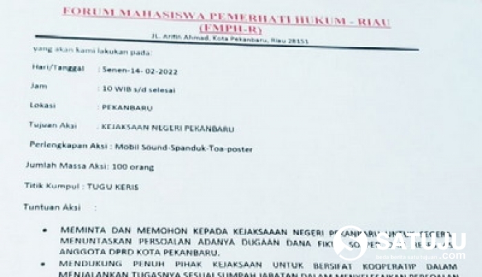 Pekanbaru, Satuju.com - Gerah tidak ditemukan dari Kejaksaan Negeri Pekanbaru terkait dugaan SPPD fiktif dana sosper dan reses 45 anggota DPRD Kota Pekanbaru yang telah dilaporkan 6 bulan silam, Forum Mahasiswa Pemerhari Hukum-Riau ( FMPH-R) akan melakukan aksi donestrasi kejaksaan negeri Pekanbaru.