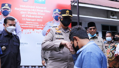 Hadir disini ketua PWNU Riau T. Rusli Ahmad, SE juga bapak Walikota Pekanbaru Dr. H. Firdaus, ST, MT dan sahabat sekalian, vaksinasi adalah variabel penting memutus mata rantai penyebaran virus covid- 19 varian Omicron yang hari ini cenderung meningkat. Selain penerapan protokol kesehatan yang ketat, juga perlu segera dilakukan percepatan vaksinasi kepada masyarakat, oleh karena itu kami bersama PWNU Riau dan Walikota Pekanbaru menginisiasi kegiatan vaksinasi dosis 1, dosis 2 dan booster untuk masyarakat termasuk lansia dan anak-anak," sebut Kapolda Riau.