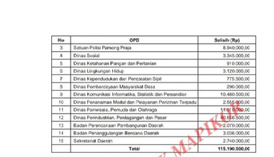 Dari laporan BPK OPD yang diduga melakukan perjalanan dinas ganda diantaranya Satuan Polisi Pamong Praja, Dinas Sosial, Dinas Ketahanan Pangan dan Pertanian, Dinas Lingkungan Hidup, Dinas Kependudukan dan Pencatatan Sipil, Dinas Pemberdayaan Masyarakat Desa,Dinas Komunikasi Informatika, Statistik dan Persandian, Dinas Penanaman Modal dan Pelayanan Perizinan Terpadu Dinas Pariwisata, Pemuda dan Olahraga, Dinas Perindustrian, Perdagangan dan Pasar Badan Perencanaan Pembangunan Daerah, Badan Penanggulangan Bencana Daerah, Sekretariat Daerah.