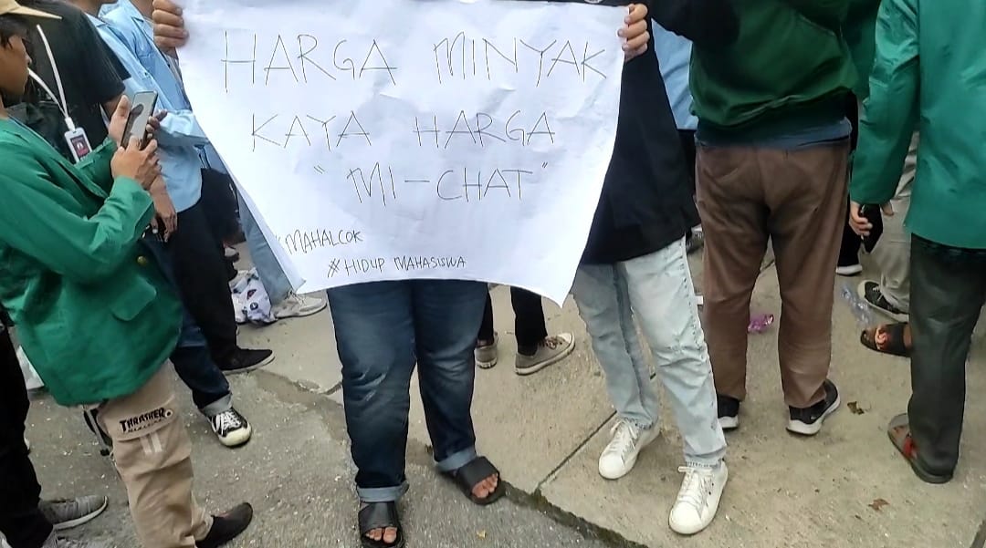 Ribuan mahasiswa itu silih berganti menyanyikan lagu darah juang dan buruh tani. Selain itu, beberapa orang memegang poster dengan tulisan, 'Harga Minyak Kayak Harga Me-Chat'.