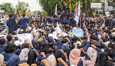 Dengan membentangkan salah spanduk,"Masyarakat!!Sudah ogah!! Si pakde mau nambah."Tolak Penundaan Pemilu Tolak Tiga Priode".